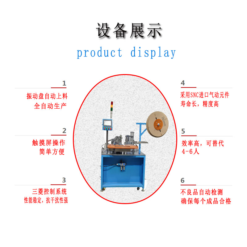 4:人工(gōng)隻需補充物(wù)料(liào),設備(bèi)自動依次完成各工序組裝,並自動下料